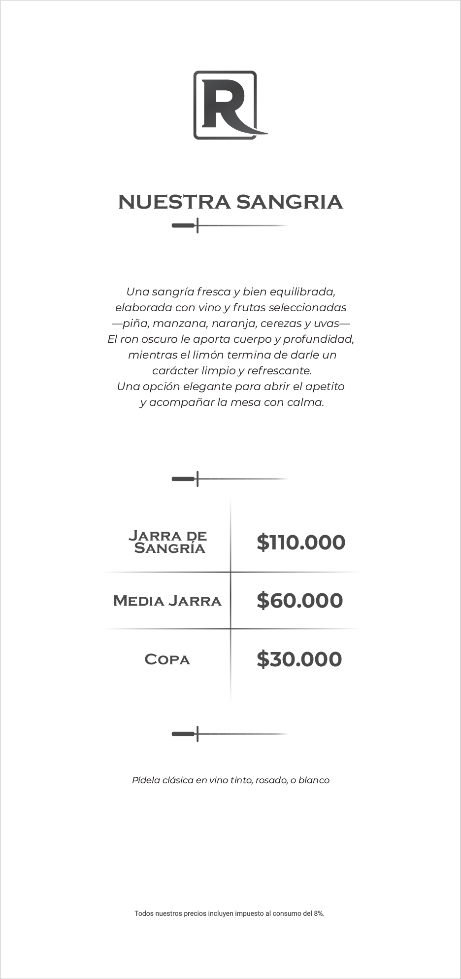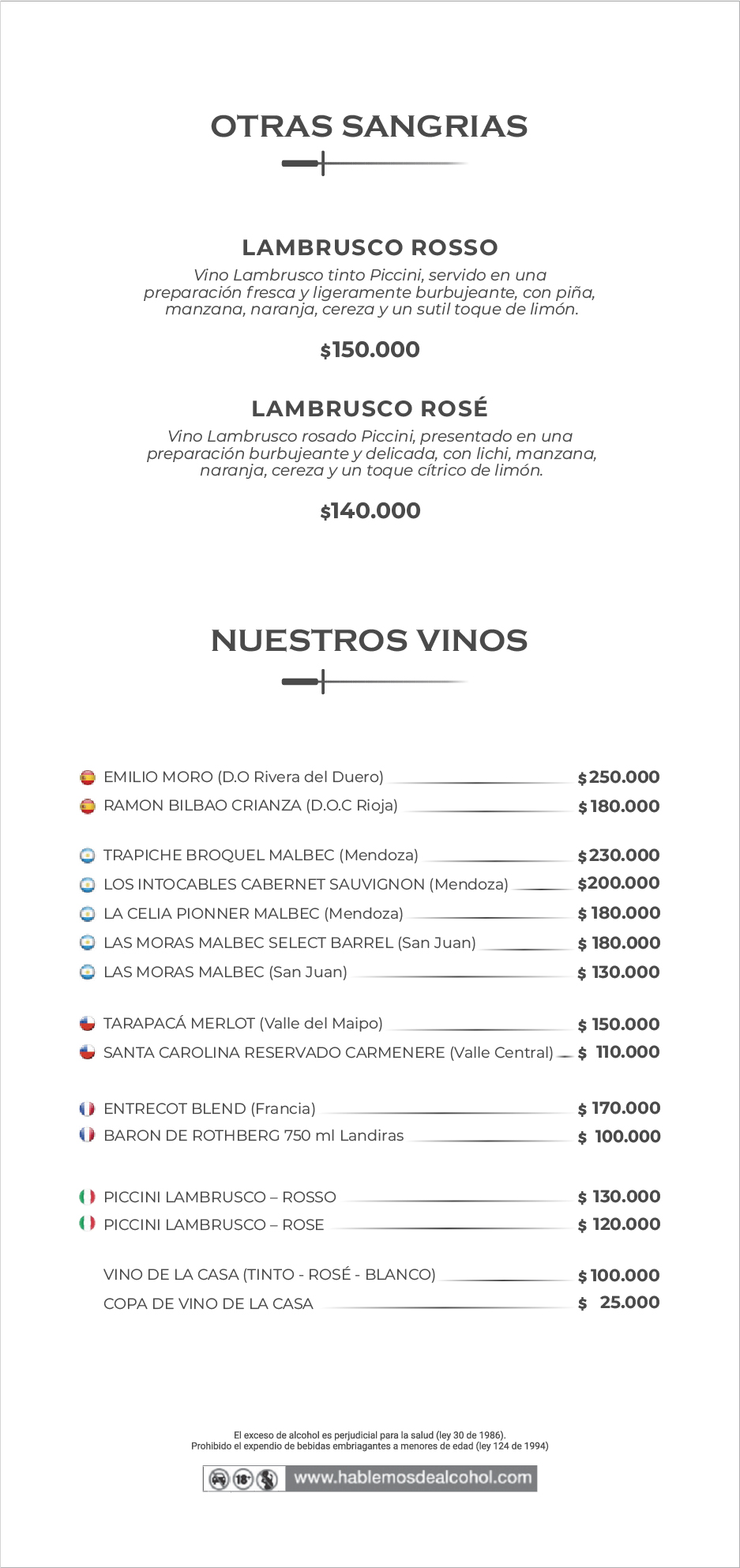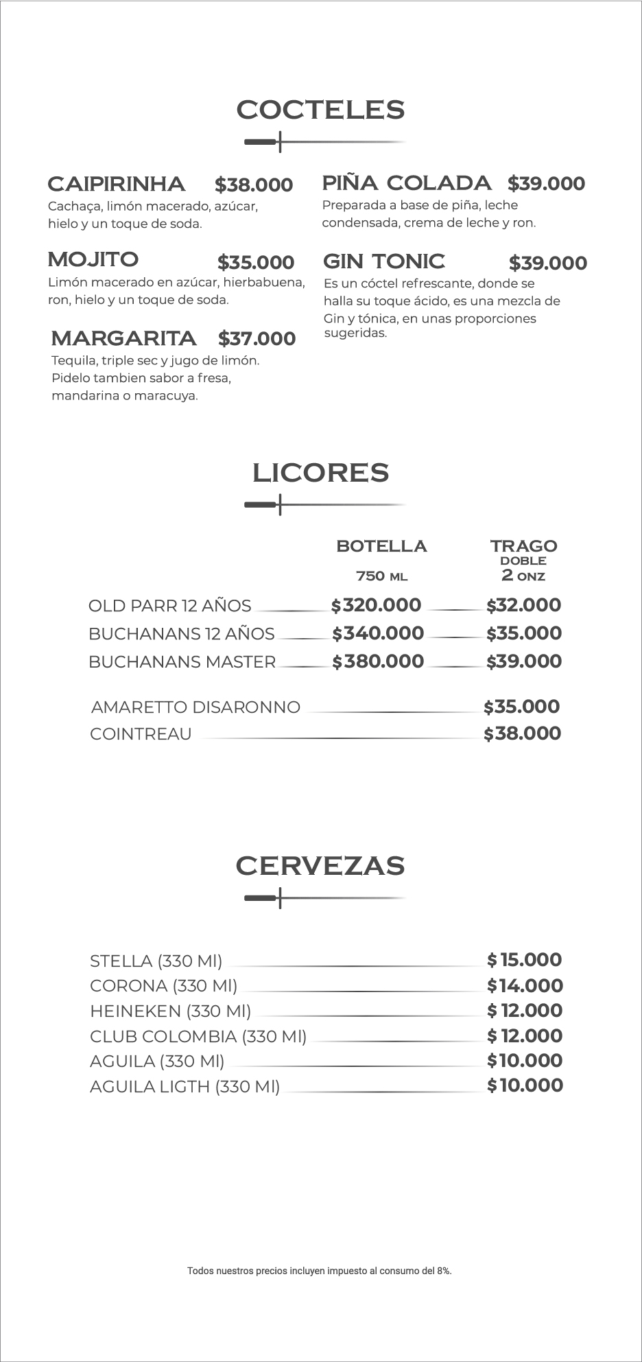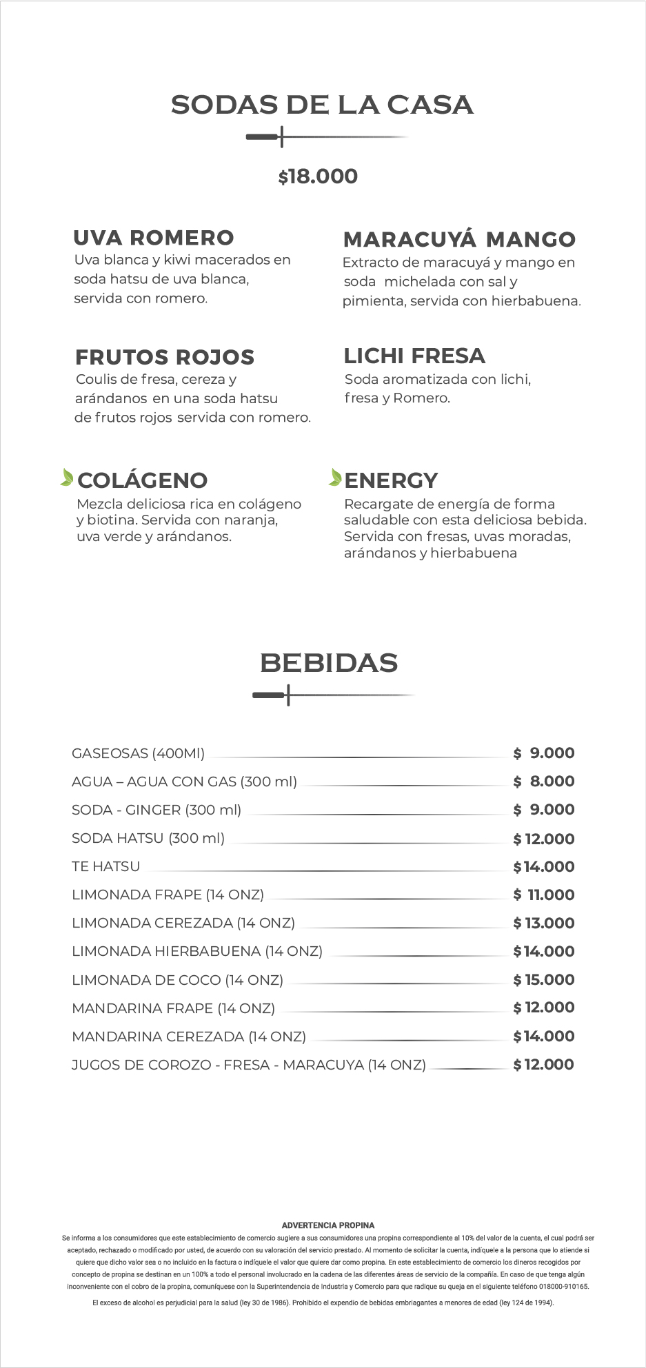 Se informa a los consumidores que este establecimiento de comercio sugiere a sus consumidores una propina correspondiente al 10% del valor de la cuenta, el cual podrá ser aceptado, rechazado o modificado por usted, de acuerdo con su valoración del servicio prestado. Al momento de solicitar la cuenta, indíquele a la persona que lo atiende si quiere que dicho valor sea o no incluido en la factura o indíquele el valor que quiere dar como propina. En este establecimiento de comercio los dineros recogidos por concepto de propina se destinan en un 100% a todo el personal involucrado en la cadena de las diferentes áreas de servicio de la compañía. En caso de que tenga algún inconveniente con el cobro de la propina, comuníquese con la Superintendencia de Industria y Comercio para que radique su queja en el siguiente teléfono 018000-910165.